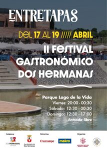 Dos Hermanas vuelve a convertirse en epicentro de la gastronomía andaluza con la celebración de «EntreTapas» II Festival Gastronómico de Dos Hermanas, un evento lleno de sabor que tendrá lugar desde el viernes 17 al domingo 19 de abril de 2026 en el Parque Lago de la Vida, en Entrenúcleos.